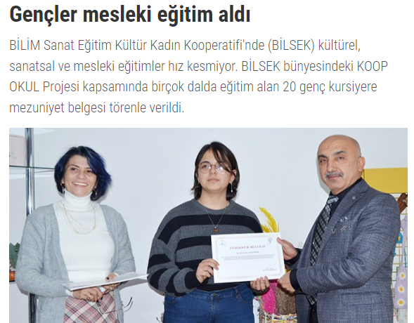 BİLSEK Başkanı Atalay, hayata geçirilen KOOP OKUL projesinin önemine değindi, 40’tan fazla stajyer ve usta öğretici adayına eğitim-öğretim hizmeti verildiğini ifade etti. Atalay, “Eğitimlerimize katılanlar, Hayat Boyu Öğrenme Projesi kapsamında halk eğitim merkezlerinde hobi olarak başladıkları kurları iş fırsatına çevirebiliyor” dedi. Atalay, BİLSEK’te 14 farklı branşta uzman öğreticilerin eğitim verdiklerini, eğitimlere kadın kooperatiflerinden de katılımın olduğunu sözlerine ekledi.